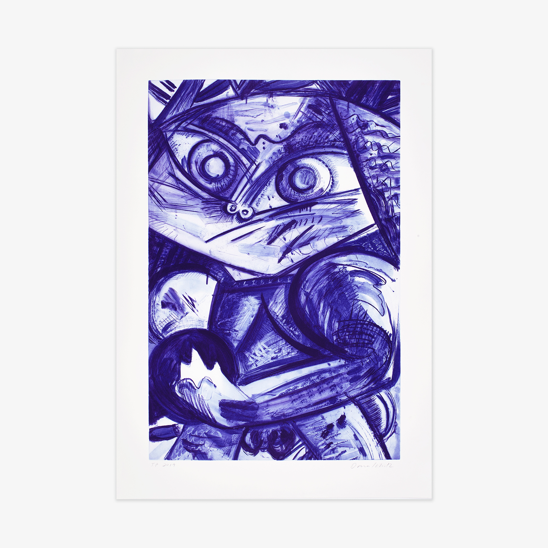 Showcasing Dana Schutz’s powerful visual language—bold, gestural, and filled with narrative tension, a monumental figure is frozen in the act of throwing, its exaggerated form bursting with energy and dark humour. A towering figure twists mid-action, its exaggerated form charged with movement and unease, Bowler reflects the artist’s interest in the absurd and the psychological, rendered here through bold mark-making and compressed tension. Known for her vivid characters and imaginative scenes, Schutz creates work that feels both chaotic and carefully composed.